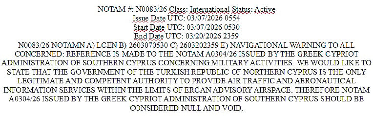 Αυτό αποδεικνύεται από το γεγονός ότι η ΥΠΑ της Κύπρου εξέδωσε την αγγελία Α 0304 για εκτέλεση στρατιωτικών δραστηριοτήτων στο βορειοανατολικό τμήμα του FIR Λευκωσίας. Για την αγγελία αυτή υπήρξε άμεση αντίδραση του ψευδοκράτους, με την οποία ισχυρίζεται ότι η κυπριακή αγγελία Α0,304/26 είναι παράνομη, καταχρηστική και άκυρη, διότι η διοίκηση της νότιας Κύπρου δεν έχει δικαίωμα να εκδίδει αγγελίες για το ERCAN advisory της Βόρειας Κύπρου, δηλαδή του ψευδοκράτους.