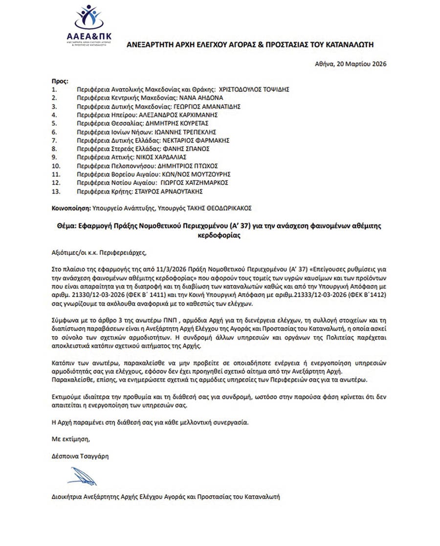 Μόλις εννέα ημέρες μετά την έκδοση της ΠΝΠ, η διοικήτρια της Αρχής Δέσποινα Τσαγγάρη απέστειλε στις 20 Μαρτίου 2026 επιστολή προς τους 13 περιφερειάρχες της χώρας (με κοινοποίηση στον υπουργό Ανάπτυξης Τάκη Θεοδωρικάκο), με την οποία αναφέρει ρητώς ότι «δεν απαιτείται η ενεργοποίηση» των υπηρεσιών Εμπορίου των Περιφερειών για τη διενέργεια ελέγχων στην αγορά!