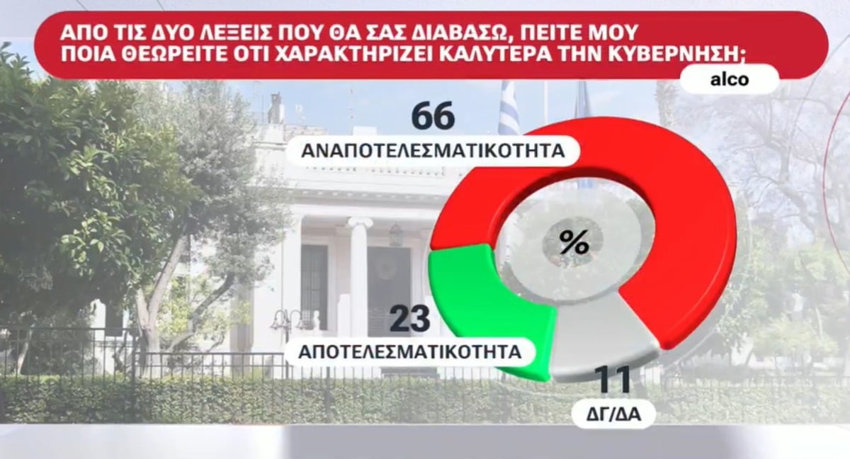 Επίσης, στο ερώτημα «Από τις δύο λέξεις που θα σας διαβάσω, πείτε μου ποια θεωρείτε ότι χαρακτηρίζει καλύτερα την κυβέρνηση» καταγράφονται οι εξής απαντήσεις: