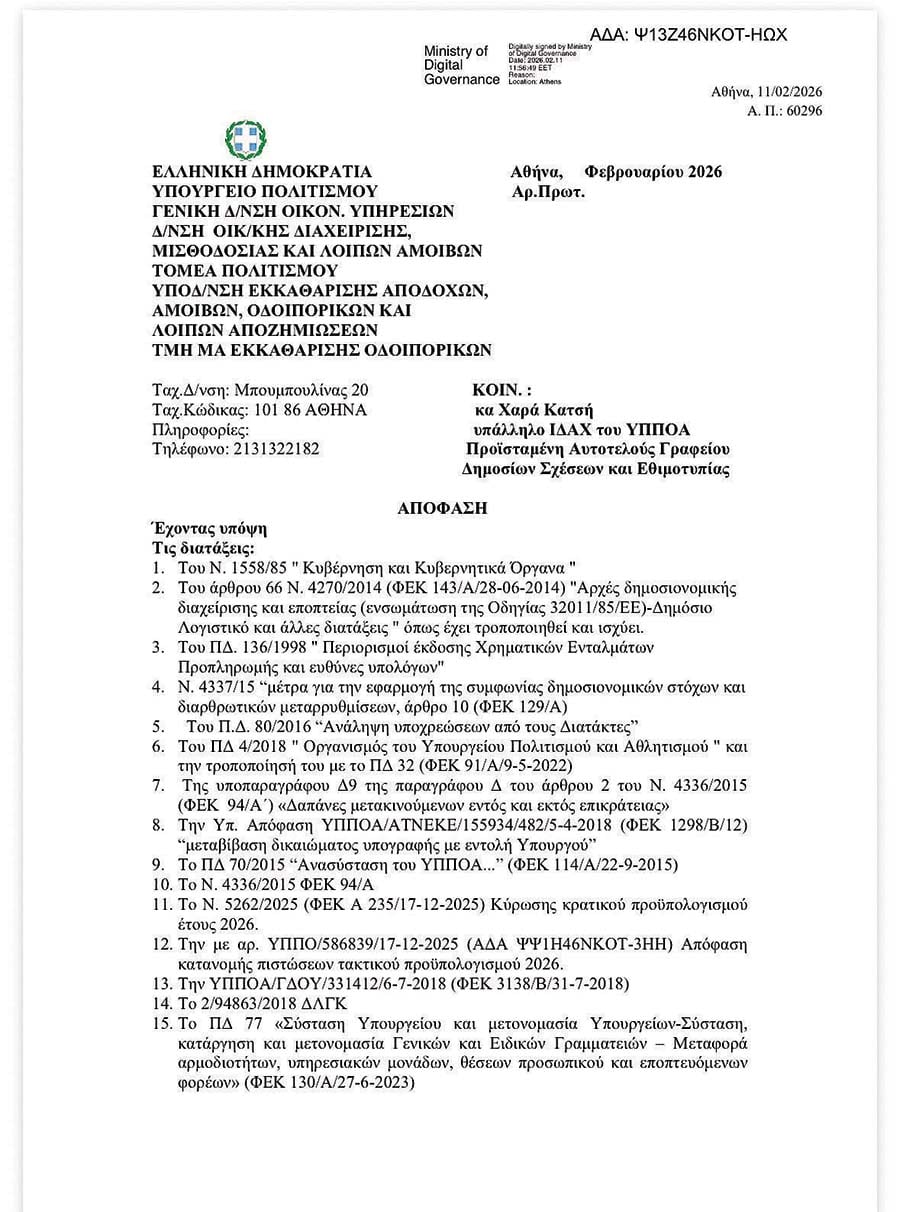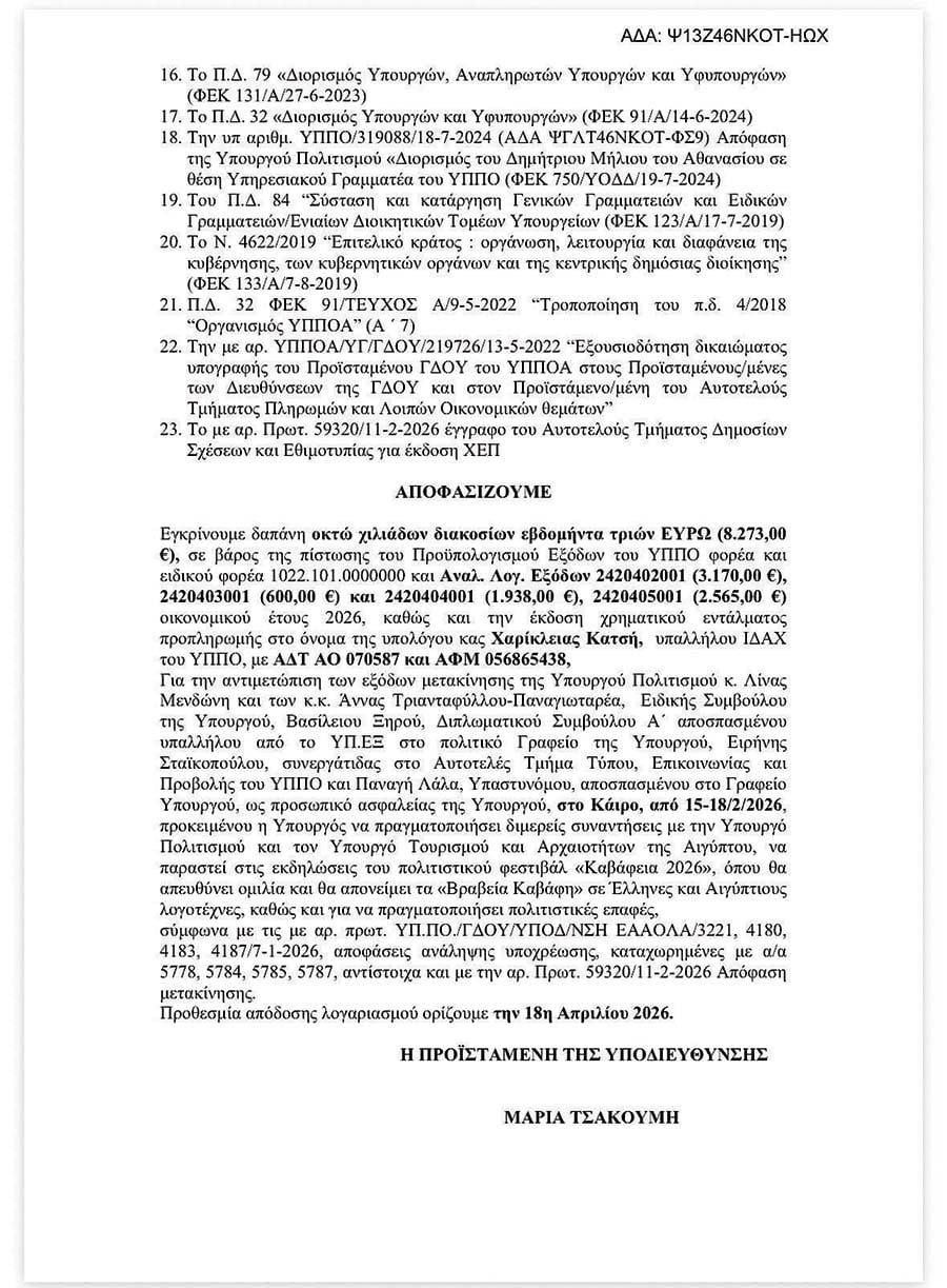 Συγκεκριμένα, σύμφωνα με την απόφαση με ΑΔΑ: Ψ13Ζ46ΝΚΟΤ-ΗΩΧ, που υπογράφει η προϊσταμένη της αρμόδιας υποδιεύθυνσης για την «εκκαθάριση οδοιπορικών και λοιπών αποζημιώσεων» Μαρία Τσακούμη, εγκρίθηκε η δαπάνη για την αντιμετώπιση των εξόδων πρόσφατης μετακίνησης της υπουργού Πολιτισμού και τετραμελούς συνοδείας της στην Αίγυπτο, με προθεσμία «απόδοσης λογαριασμού» τη 18η Απριλίου 2026. Συγκεκριμένα μαζί της πήγαν, όπως αναφέρεται, η ειδική σύμβουλος, ο διπλωματικός σύμβουλος, η συνεργάτιδα επικοινωνίας και προβολής και ο προσωπικός αστυνομικό φρουρός της.