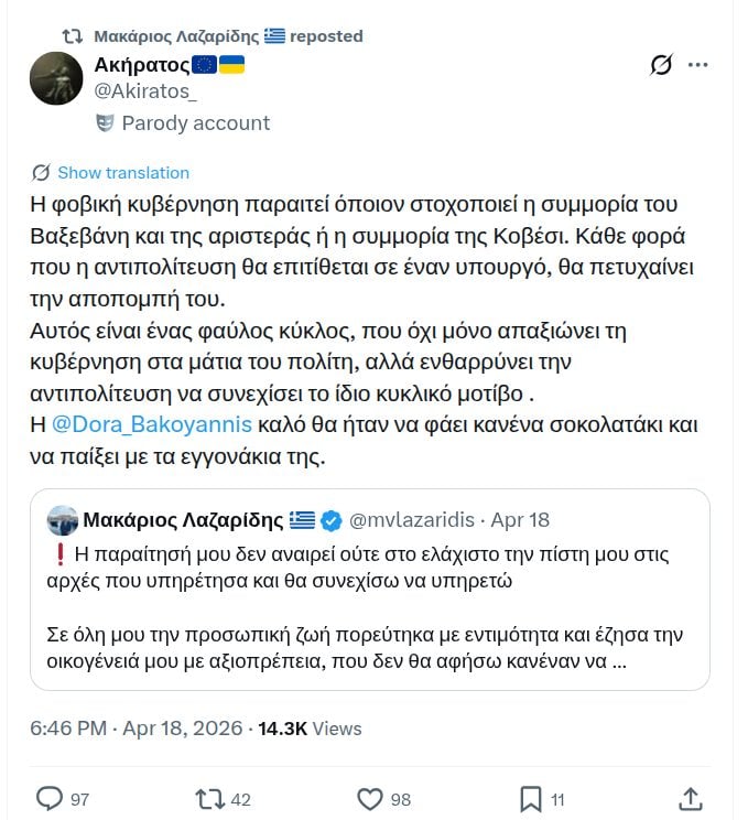 Υποστήριξε ότι «τον κ. Λαζαρίδη τον παραίτησε η πίεση της αντιπολίτευσης, οι δικές του αστοχίες και οι προκλήσεις και το ότι χθες φάνηκε να υπάρχει ένα ρήγμα εσωτερικά στη Νέα Δημοκρατία, όπως εκφράστηκε από τη δήλωση της κας Μπακογιάννη».