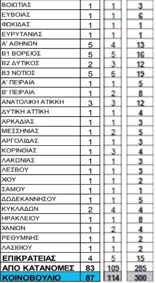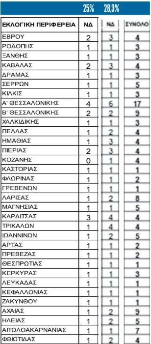 Στη λίστα που αποκαλύπτουμε έχει αποτυπωθεί πόσες έδρες -με βάση τον αλγόριθμο Λιβάνιου- θα πάρει σε κάθε νομό η Ν.Δ., σε σύγκριση με τους βουλευτές που διαθέτει στις ίδιες περιοχές σήμερα. Υπάρχουν μάλιστα και νομοί που, ενώ σήμερα η Ν.Δ. έχει σχεδόν την πλήρη κυριαρχία, όπως στην Κοζάνη, κινδυνεύει να μην πάρει καμία έδρα. Επίσης, όπως φαίνεται εύκολα, σε αρκετές περιοχές που τώρα υπάρχει μόνο το «γαλάζιο» χρώμα στον εκλογικό χάρτη, απειλείται μεγάλη πανωλεθρία και κινδυνεύουν να μείνουν εκτός Βουλής ηχηρά ονόματα.