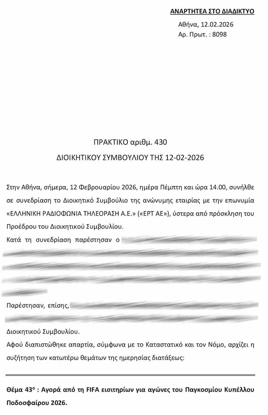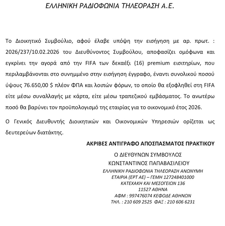 Στην Αθήνα, σήμερα, 12 Φεβρουαρίου 2026, ημέρα Πέμπτη και ώρα 14.00, συνήλθε σε συνεδρίαση το Διοικητικό Συμβούλιο της ανώνυμης εταιρίας με την επωνυμία ΕΛΛΗΝΙΚΗ ΡΑΔΙΟΦΩΝΙΑ ΤΗΛΕΟΡΑΣΗ Α.Ε. (ΕΡΤ Α.Ε.), ύστερα από πρόσκληση του Προέδρου του Διοικητικού Συμβουλίου… Αφού διαπιστώθηκε απαρτία, σύμφωνα με το Καταστατικό και τον Νόμο, αρχίζει η συζήτηση των κατωτέρω θεμάτων της ημερησίας διατάξεως: Θέμα 43ο: Αγορά από τη FIFA εισιτηρίων για αγώνες του Παγκοσμίου Κυπέλλου Ποδοσφαίρου 2026. ……………………………………………………………………………………………………………………….. ΕΛΛΗΝΙΚΗ ΡΑΔΙΟΦΩΝΙΑ ΤΗΛΕΟΡΑΣΗ Α.Ε. 2 Το Διοικητικό Συμβούλιο, αφού έλαβε υπόψη την εισήγηση με αρ. πρωτ. 2026/237/10.02.2026 του Διευθύνοντος Συμβούλου, αποφασίζει ομόφωνα και εγκρίνει την αγορά από τη FIFA των δεκαέξι (16) premium εισιτηρίων, που περιλαμβάνονται στο συνημμένο στην εισήγηση έγγραφο, έναντι συνολικού ποσού ύψους $76.650,00 πλέον ΦΠΑ και λοιπών φόρων, το οποίο θα εξοφληθεί στη FIFA είτε μέσω συναλλαγής με κάρτα, είτε μέσω τραπεζικού εμβάσματος. Το ανωτέρω ποσό θα βαρύνει τον προϋπολογισμό της εταιρίας για το οικονομικό έτος 2026. Ο Γενικός Διευθυντής Διοικητικών και Οικονομικών Υπηρεσιών ορίζεται ως δευτερεύων διατάκτης».