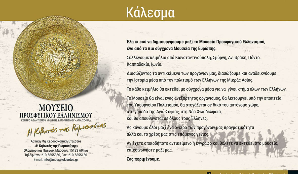 Κάλεσμα για συμβολή στη μεγάλη προσπάθεια για τη διάσωση και ανάδειξη της ιστορίας και του πολιτισμού των Ελλήνων της Μικράς Ασίας απευθύνει το Μουσείο Προσφυγικού Ελληνισμού «Η Κιβωτός της Ρωμιοσύνης».