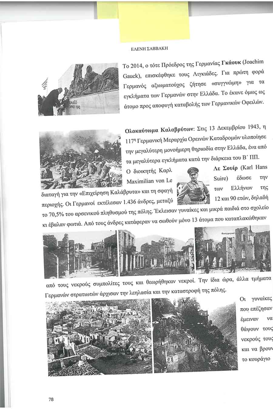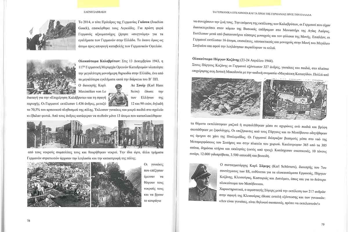 Ενα συγκλονιστικό όσο και αποκαλυπτικό βιβλίο προσφέρει η «δημοκρατία» στους αναγνώστες της εντός Αττικής αυτή την Κυριακή. Πρόκειται για το βιβλίο με τον τίτλο «Τα γερμανικά εγκλήματα και τα χρέη της Γερμανίας προς την Ελλάδα», το οποίο συνέγραψε η Ελένη Σαββάκη. Πρόκειται για ένα πολύτιμο εγχειρίδιο, που συμβάλλει καίρια στην απόκτηση της ιστορικής γνώσης και συγχρόνως στην εθνική αφύπνιση της ελληνικής κοινωνίας – η οποία συστηματικά συνεχίζει να αγνοεί την πραγματική διάσταση των γεγονότων.