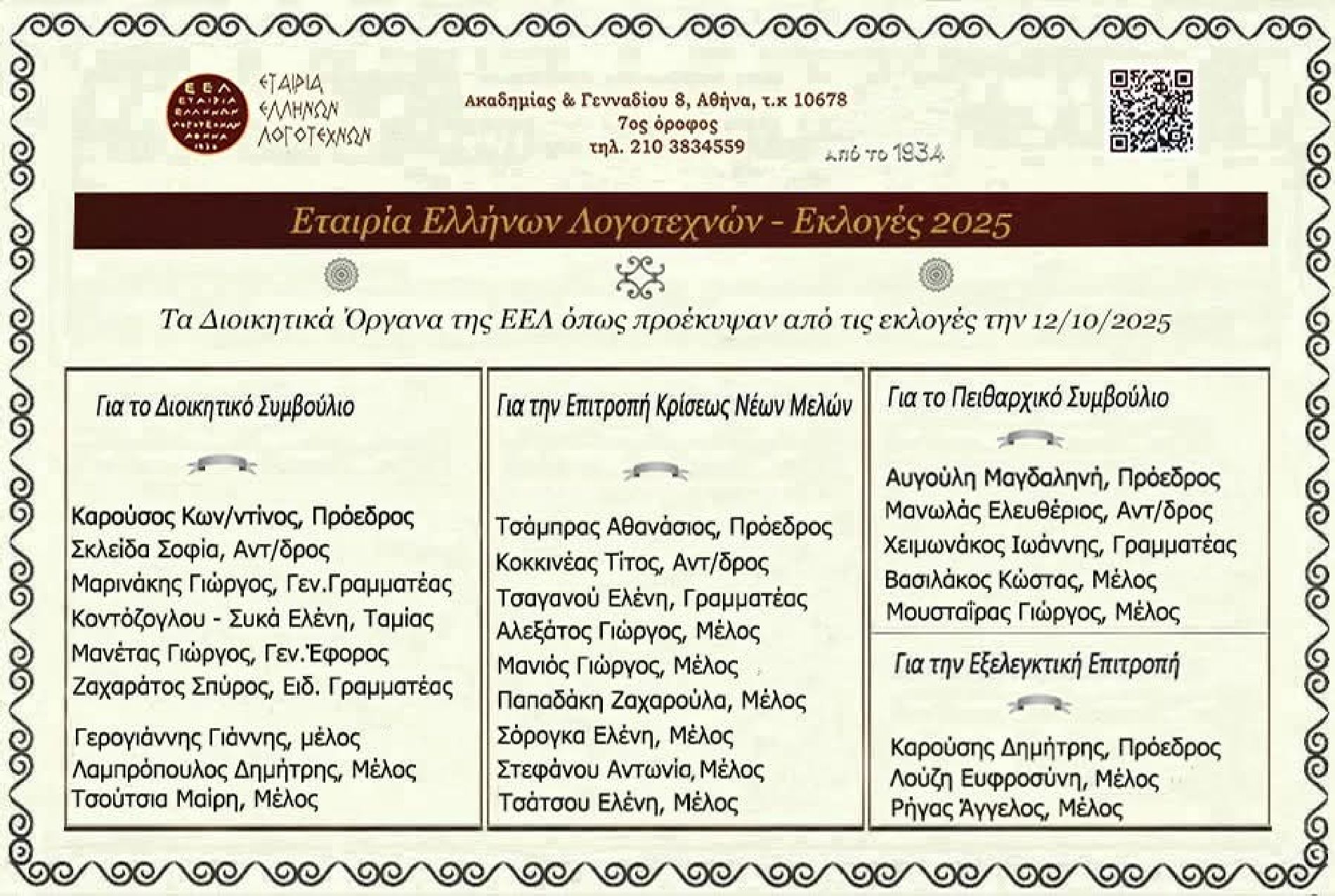 Ετσι, η Εταιρεία Ελλήνων Λογοτεχνών (ΕΕΛ), ένας από τους παλαιότερους και σημαντικότερους πνευματικούς θεσμούς της χώρας μας, με ιστορία που ξεπερνά τα 90 χρόνια, αποτελεί τον θεσμό εκείνο που εξακολουθεί να κρατά ζωντανή τη φλόγα της ελληνικής σκέψης και της λογοτεχνίας, να συνδέει τις γενιές των δημιουργών και να υπενθυμίζει ότι ο πολιτισμός είναι τρόπος ζωής.