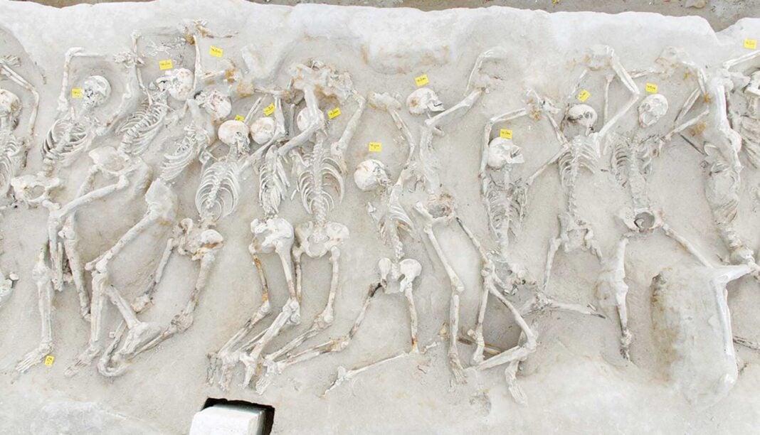 Πρόκειται για σιδηροδέσμιους άνδρες εναποθετημένους σε τρεις σειρές, άλλοι δεμένοι πισθάγκωνα και άλλοι δεμένοι μεταξύ τους, φέροντας θανατηφόρο χτύπημα στο κεφάλι. Η εκτέλεσή τους συνδέεται από την ανασκαφέα με την περίοδο πολιτικών αναταραχών που σημειώνονται από τον πρώιμο 7ο αιώνα π.Χ. και διήρκεσαν έως και τον 6ο αιώνα π.Χ. Το 2016 αποφασίστηκε η κατά χώραν διατήρηση και ανάδειξη των ευρημάτων και η κατασκευή κελύφους προστασίας.