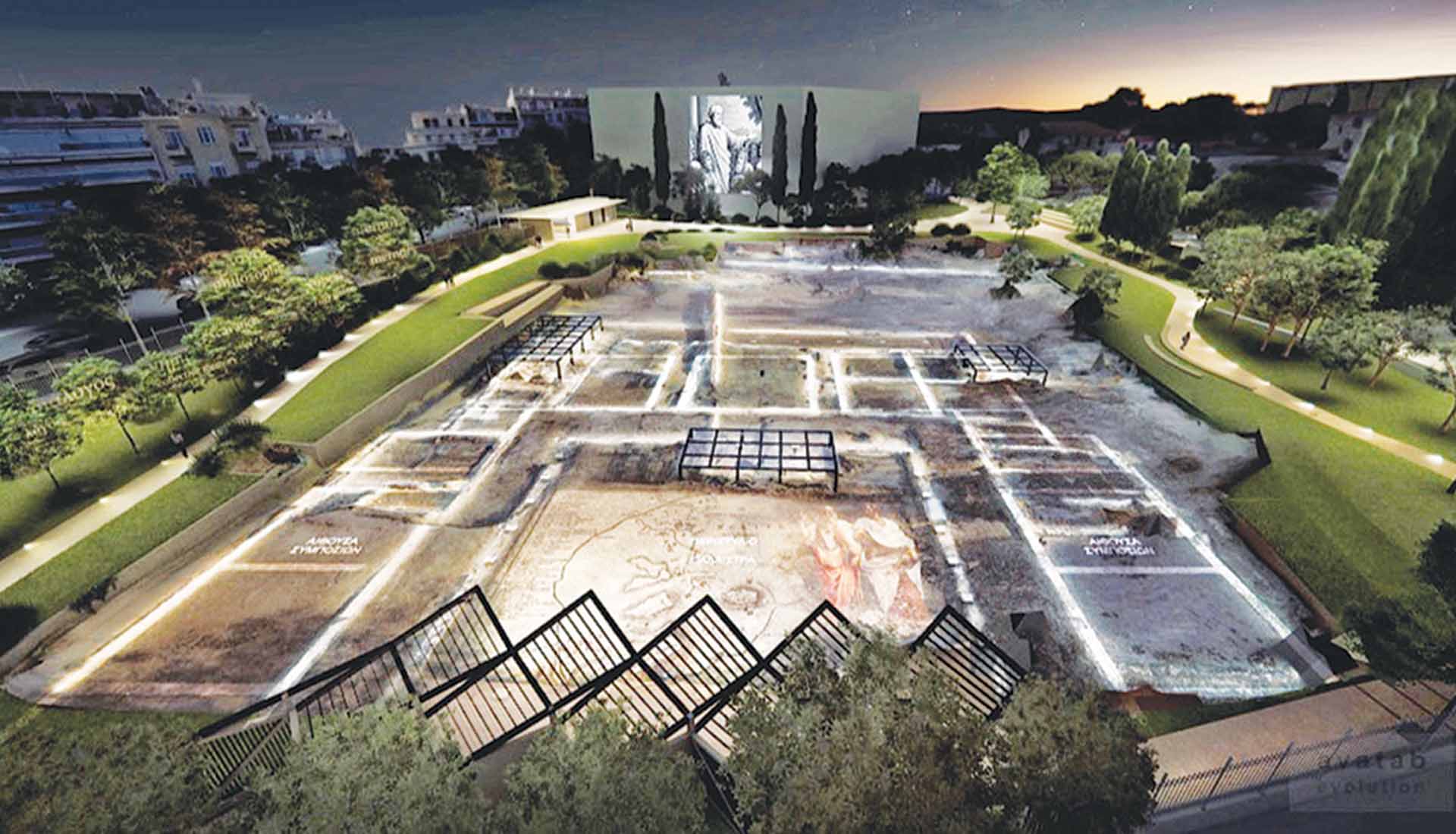 Κατά την ίδια περίοδο εντάχθηκαν, στο βορειοανατολικό και βορειοδυτικό τμήμα της παλαίστρας, τα λουτρά που πιθανότατα αντικατέστησαν τους προγενέστερους λουτρώνες των κλασικών χρόνων. Πιθανώς όλος ο χώρος επεκτεινόταν έως την πλατεία Κολωνακίου. Το έργο υλοποιείται κατόπιν εκτεταμένου τρισδιάστατου ψηφιακής τεκμηριώσεως του χώρου, σε συνδυασμό αεροφωτογραμμετρίας, στατικής σάρωσης λέιζερ και κινητής φωτογραμμετρίας. Παραπλεύρως της εισόδου χωροθετείται επίμηκες κτίριο υποδοχής των επισκεπτών, που αναπτύσσεται παραλλήλως με την οδό Ρηγίλλης. Δημιουργούνται, από το Ωδείο, στο νότιο τμήμα του αρχαιολογικού χώρου, δευτερεύουσα είσοδος και στάση επισκεπτών.