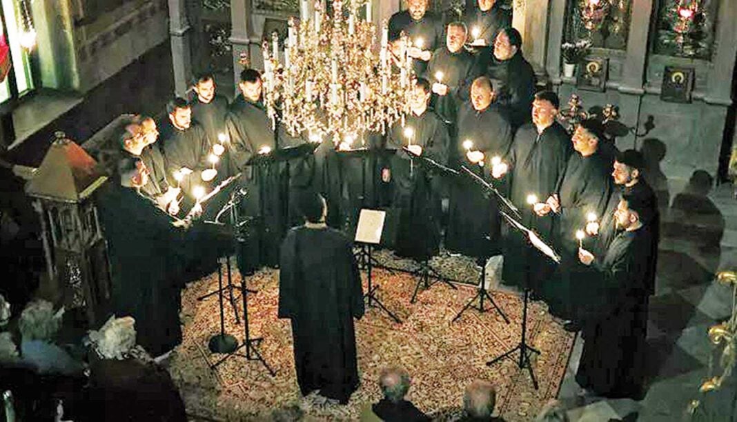 Η βυζαντινή χορωδία music Aeterna byzantina, με ιδρυτή και καλλιτεχνικό διευθυντή τον Θεόδωρο Κουρεντζή, θα υμνήσει τον Πατέρα και Υιόν, ερμηνεύοντας, μεταξύ άλλων, και ύμνους που σπάνια ακούγονται στις ιερές ακολουθίες, όπως το «Εισελεύσομαι», «Ο τον αμπελώνα φυτεύσας» «Τεριρέμ» κ.ά.