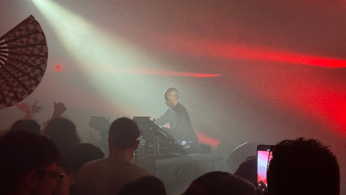Το μέρος λούστηκε από κόκκινα φώτα και στην σκηνή οι διοργανωτές έφεραν τέσσερα decks, έναν μικτή και ένα Roland TR-909, το θρυλικό drum machine, με το οποίο ο Mills αναδιαμορφώνει ζωντανά τα κομμάτια που μιξάρει. Σκέφτηκα ότι ξεκινάμε… Η σκηνή μαύρισε και ένα λευκό φως φώτισε πάνω σε μια μαυροφορεμένη φιγούρα, ήταν αυτός, σκυφτός πάνω από τον εξοπλισμό του.