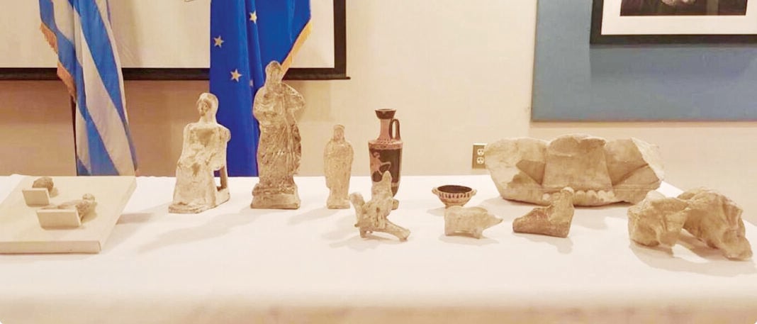 Είκοσι έξι αρχαία αντικείμενα ελληνικής προελεύσεως παρέλαβε σε ειδική εκδήλωση που πραγματοποιήθηκε στην πρεσβεία της Ελλάδος στην Ουάσινγκτον η υπουργός Πολιτισμού Λίνα Μενδώνη.