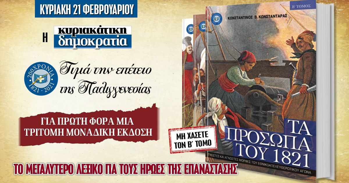 Την Κυριακή 21.02 η «δημοκρατία» τιμά την 200η επέτειο της Παλιγγενεσίας και παρουσιάζει για πρώτη φορά, μία τρίτομη μοναδική έκδοση με εκατοντάδες ονόματα και βιογραφικά από γνωστές και άγνωστες μορφές του εθνικοαπελευθερωτικού αγώνα.