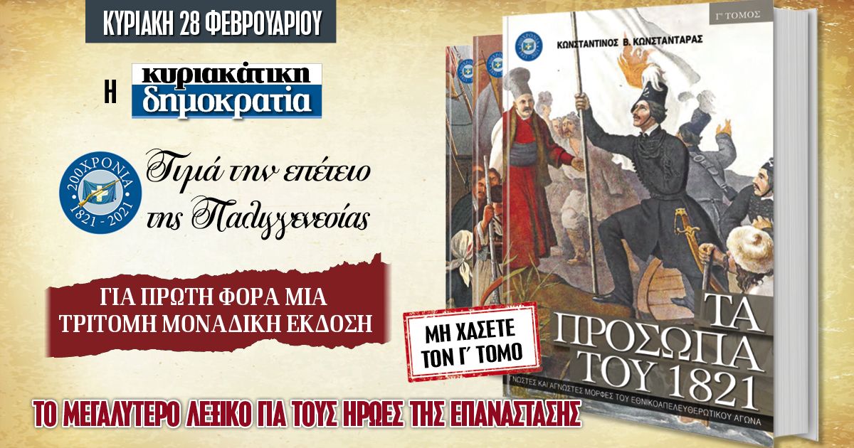 Την Κυριακή 28.02 η «δημοκρατία» τιμά την 200η επέτειο της Παλιγγενεσίας και παρουσιάζει για πρώτη φορά, μία τρίτομη μοναδική έκδοση με εκατοντάδες ονόματα και βιογραφικά από γνωστές και άγνωστες μορφές του εθνικοαπελευθερωτικού αγώνα.
