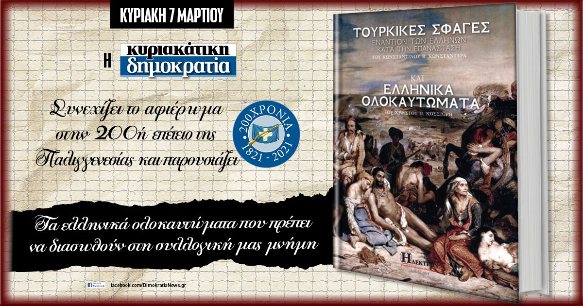 Την Κυριακή 07.03 η «δημοκρατία» συνεχίζει το αφιέρωμα στην 200η επέτειο της Παλιγγενεσίας και παρουσιάζει ένα βιβλίο για τις  Τούρκικες σφαγές που έγιναν σε βάρος των Ελλήνων, αλλά και στα ελληνικά ολοκαυτώματα που έγιναν με ηρωισμό και πρέπει να θυμόμαστε με δόξα!