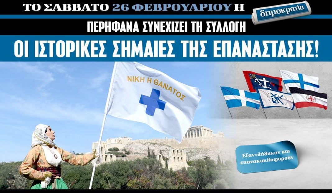 Το Σάββατο 26.02 η «δημοκρατία» περήφανα συνεχίζει την συλλογή: Οι ιστορικές σημαίες της Επανάστασης!