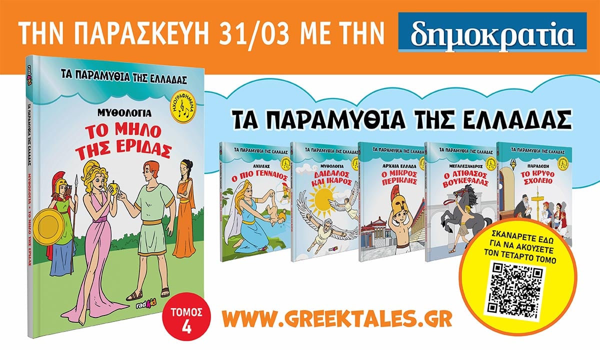 Ο τέταρτος τόμος της συλλογής ΤΑ ΠΑΡΑΜΥΘΙΑ ΤΗΣ ΕΛΛΑΔΑΣ κυκλοφορεί μαζί με την έξτρα έκδοση της «δημοκρατίας» την Παρασκευή 31 Μαρτίου, με τιμή 4,90€. Είναι αφιερωμένος στο περίφημο Μήλο της Έριδας της μυθολογίας μας.