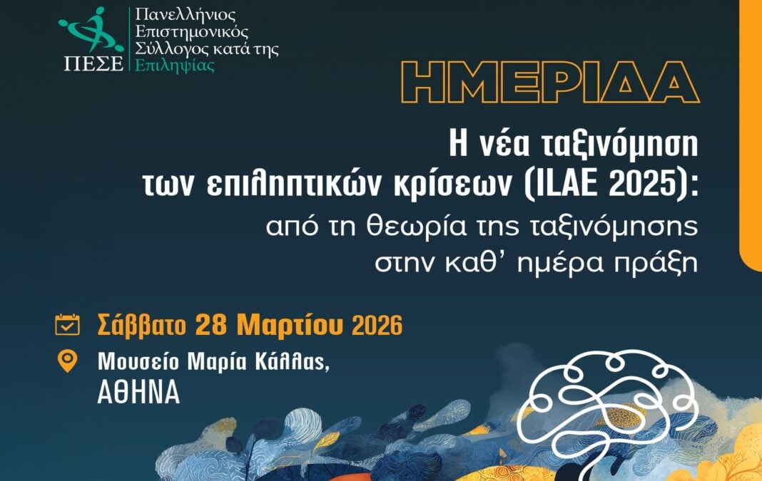Μία ιδιαίτερα σημαντική επιστημονική εκδήλωση αφιερωμένη στις σύγχρονες εξελίξεις στην Επιληπτολογία διοργανώνει το Σάββατο, 28 Μαρτίου 2026 ο Πανελλήνιος Επιστημονικός Σύλλογος κατά της Επιληψίας (Π.Ε.Σ.Ε.), με τίτλο: «Η νέα ταξινόμηση των επιληπτικών κρίσεων (ILAE 2025): από τη θεωρία της ταξινόμησης στην καθ’ ημέρα πράξη».