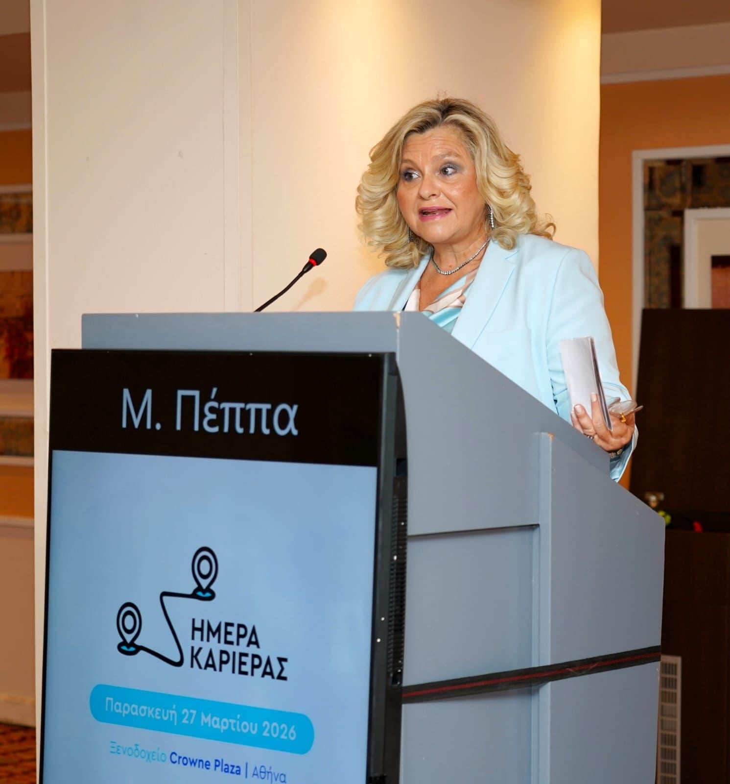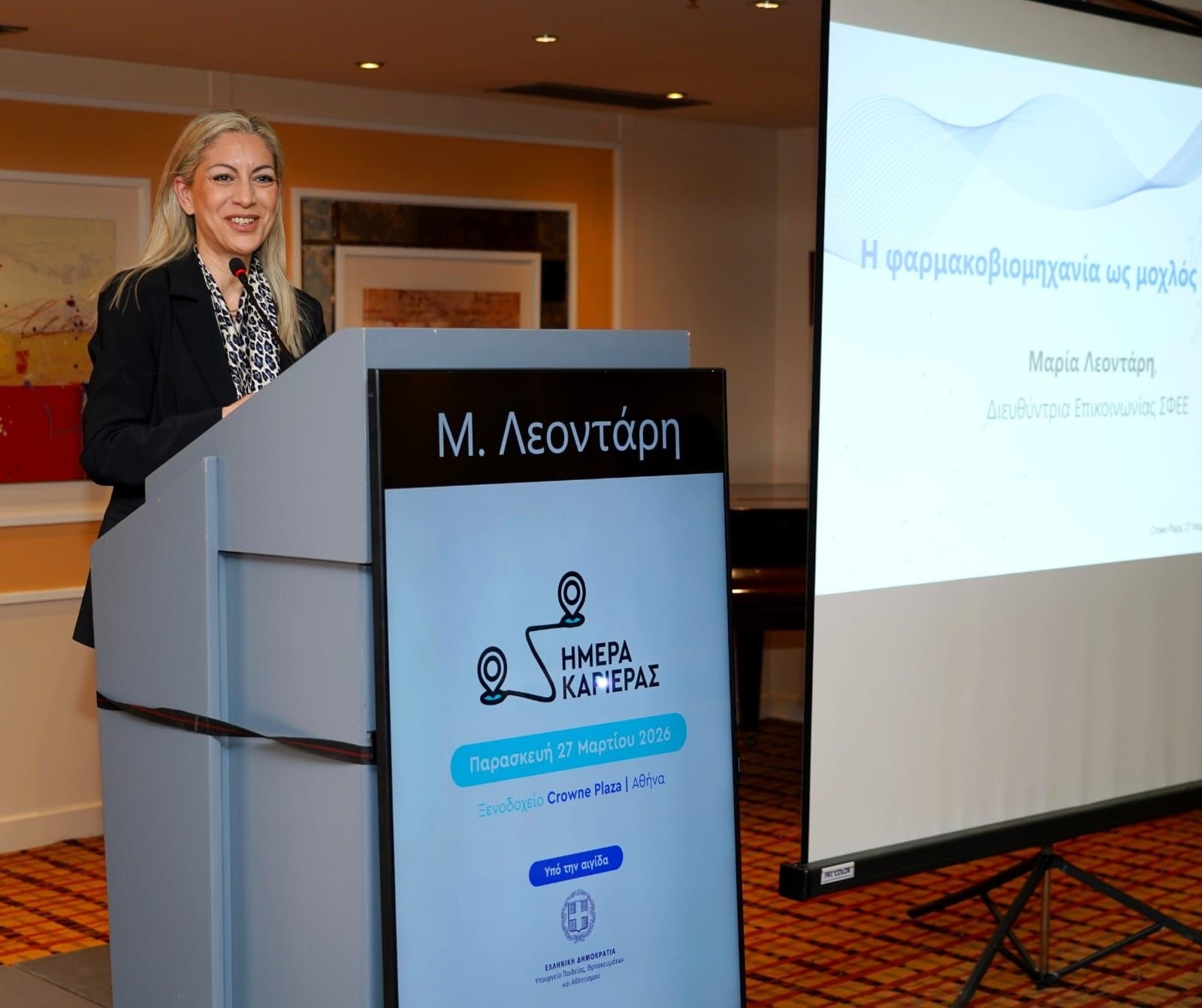 Η Διευθύντρια Επικοινωνίας του ΣΦΕΕ, κα Μαρία Λεοντάρη στον χαιρετισμό της ανέφερε: «Για τρίτη συνεχή χρονιά δίνουμε το “παρών” στην Ημέρα Καριέρας, ενισχύοντας μια πρωτοβουλία που αποτυπώνει τη σταθερή μας δέσμευση να αναδεικνύουμε και να αξιοποιούμε το πολυτιμότερο κεφάλαιο της χώρας μας: τους νέους ανθρώπους. Ο φαρμακευτικός κλάδος συγκαταλέγεται στους πιο δυναμικούς πυλώνες της ελληνικής οικονομίας, με συνολική συνεισφορά στο ΑΕΠ που υπερβαίνει τα 6,9 δισ. ευρώ και με 119.000 απασχολούμενους, συμβάλλοντας ουσιαστικά τόσο στην απασχόληση όσο και στην καινοτομία. Πάνω απ’ όλα, όμως, η μεγαλύτερη συνεισφορά του είναι στη Δημόσια Υγεία, στηρίζοντας καθημερινά τους Έλληνες ασθενείς και τις οικογένειές τους. Στον ΣΦΕΕ, μαζί με τις εταιρείες-μέλη μας, παραμένουμε προσηλωμένοι στη στήριξη της νέας γενιάς επιστημόνων, επενδύοντας συστηματικά στην εκπαίδευση, την ανάπτυξη δεξιοτήτων και τα προγράμματα δια βίου μάθησης που διαμορφώνουν τα στελέχη του αύριο».